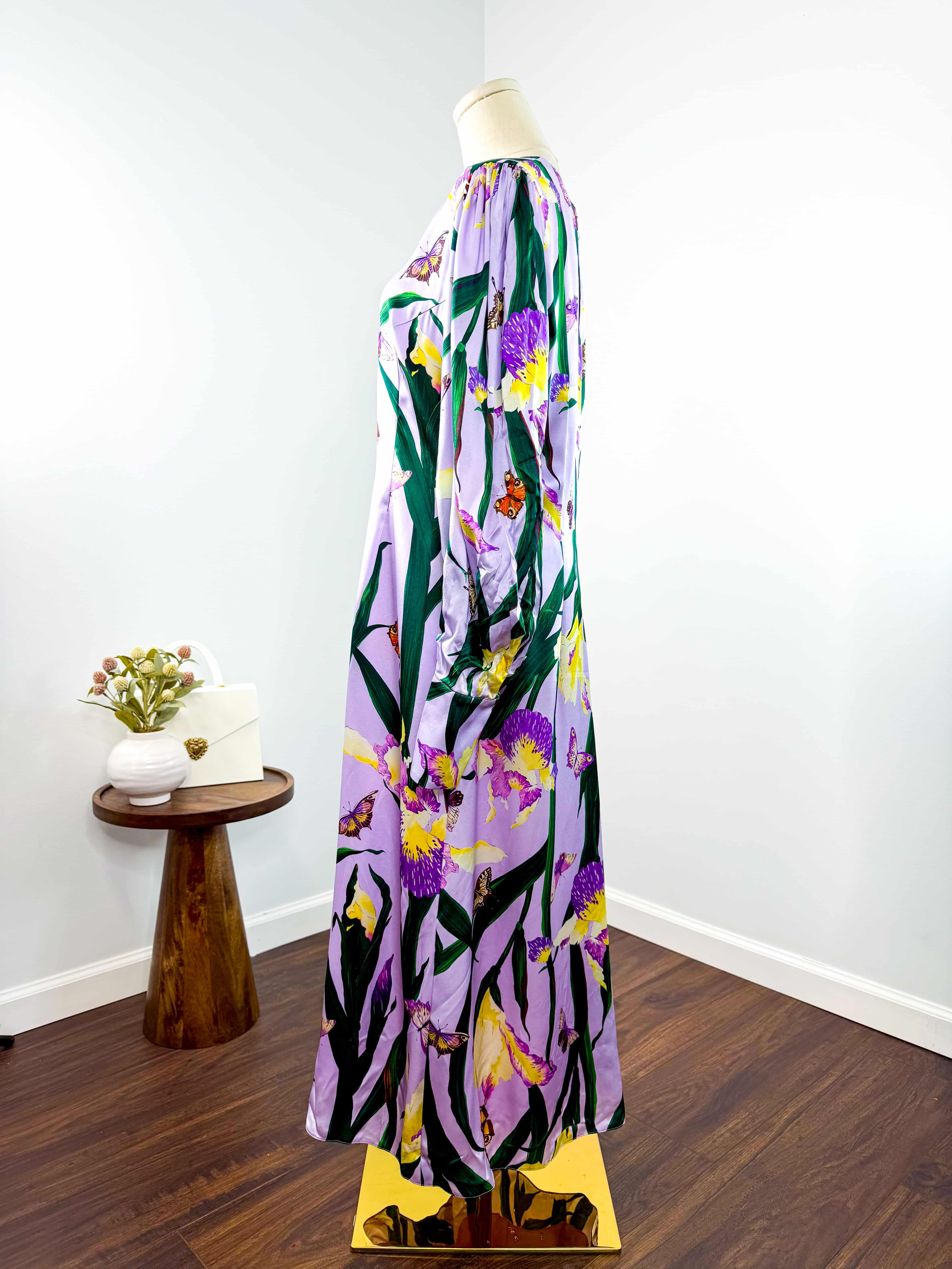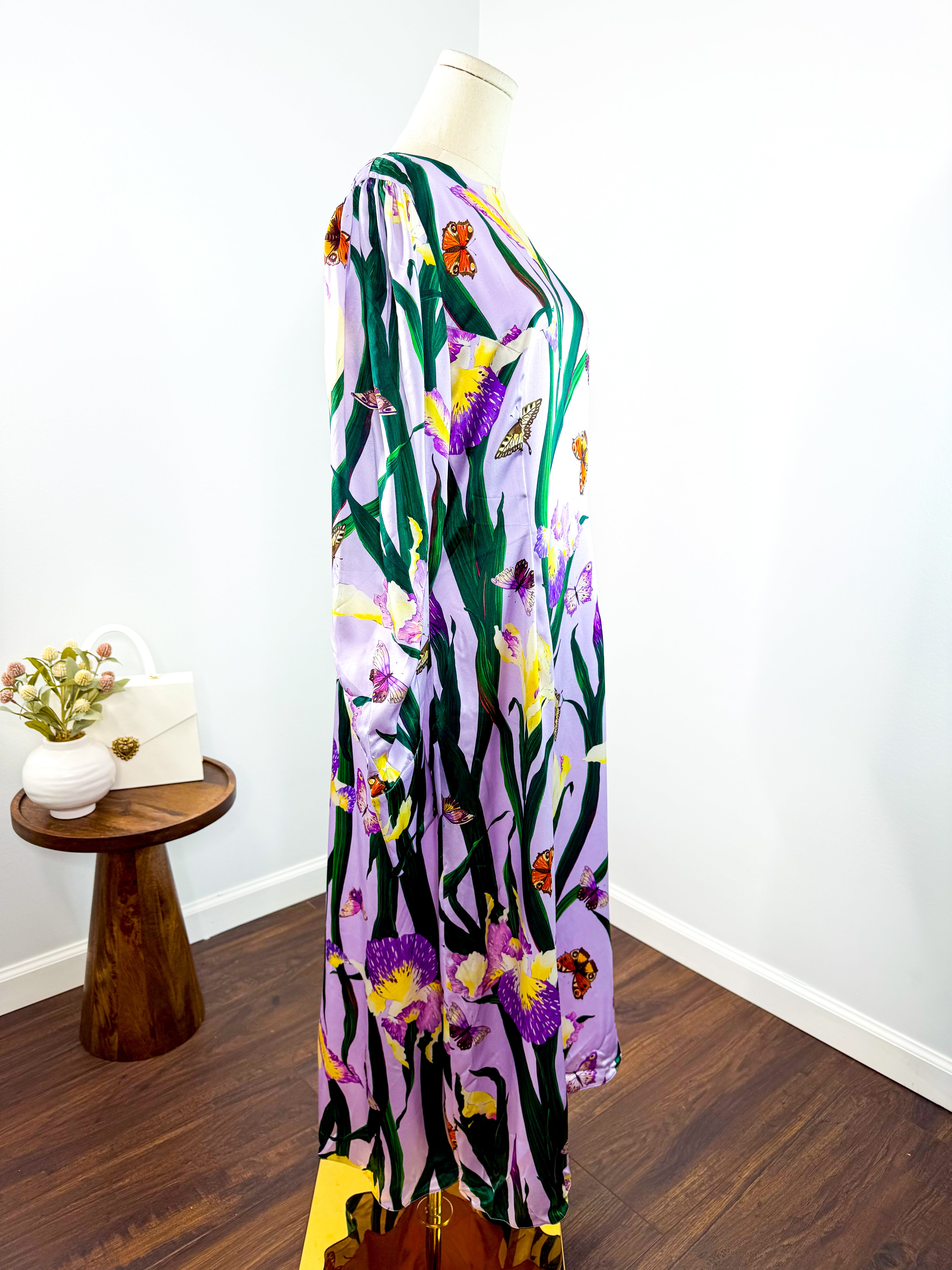 Andrew Gn satin dress featuring a garden print and crystal embellished self-belt • Round neckline • Long puff sleeves; button cuffs • A-line silhouette • Hem falls below the knee • Invisible back zip • Silk • Lining: Polyester/viscose • Dry clean • Made in Italy